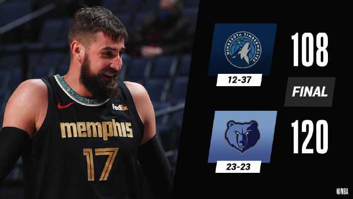 JRS直播网4月2日讯 灰熊坐镇主场迎战森林狼,目前灰熊排名西部第10,距离第8的马刺还有1.5个胜场,森林狼是他们冲击季后赛道路上必须拿下的对手,此役卢比奥因伤缺阵。首节两队开局势均力敌,森林狼虽然打出8-0的小高潮,但灰熊靠着替补球员给力的发挥还是将比分反超,次节灰熊一波15-3将分差扩大到两位数,然而顽强的森林狼却用一阵三分雨将劣势抹平。下半场,森林狼一度陷入4分多钟的得分荒,好在他们抓住瓦兰丘纳斯4犯下场之际打出15-5的攻击波完成反超,但灰熊却在末节多点开花打出23-6的攻击狂潮将分差拉大到20分以上,森林狼后继乏力未能顶住对手的猛攻,最终灰熊主场120-108击败森林狼,距离西部第8只有一步之遥。