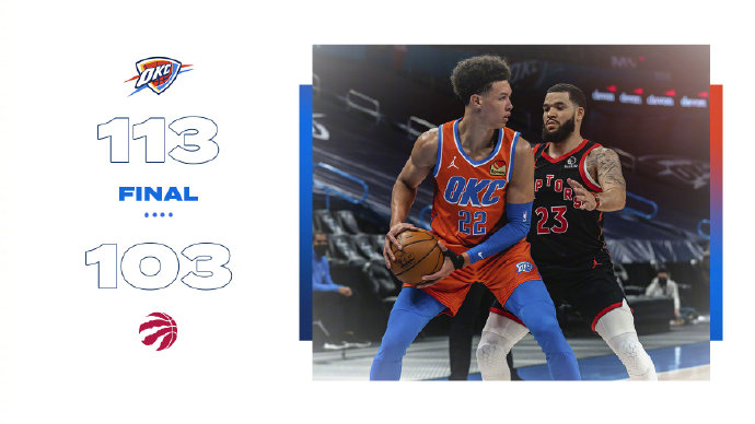JRS直播网3月31日讯 3连败的猛龙与3连败的雷霆不期而遇,此役雷霆的亚历山大、波库舍夫斯基和猛龙的洛瑞均高挂免战牌。首节猛龙下起一波三分雨,阿奴诺比、特伦特和西亚卡姆的连续六记三分率队打出17-3的攻击波早早便确立了领先优势,雷霆也不甘示弱,他们很快就回敬一波15-3缩小分差,次节猛龙的三分雨仍在继续,雷霆则靠着摩西-布朗、罗比在内线的优势紧咬比分。下半场雷霆三军用命终于反超了比分,猛龙三分命中率急剧下滑,再加上内线篮板被完爆(全场输了29个),很快便陷入被动局面,末节米哈伊柳克用连续的高光表现带领球队扩大分差,猛龙则是手感全无,单节仅得到14分,最终雷霆主场以113-103力克猛龙,终结自己三连败的同时也送给猛龙四连败。