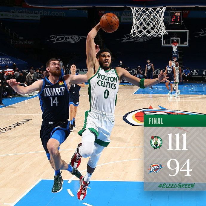 JRS直播网3月28日讯 NBA常规赛,雷霆今日迎战凯尔特人,前者上场比赛输给了灰熊排在西部第十三位,而后者上场比赛则是战胜了雄鹿,暂列东部第七位,本场亚历山大、霍福德和沃克等人缺战。比赛上来多特就表现出了火热的状态,个人连拿八分帮助雷霆取得领先,凯尔特人首发的糟糕表现让分差逐渐达到了两位数,好在是替补球员上来后迫近比分,次节双探花终于回暖一度追平比分,但一直未能实现反超,半场结束时雷霆领先5分。易边再战,凯尔特人依旧被对手压制,不过到了末节雷霆突然开始不得分,前六分钟仅靠罚球拿到两分,凯尔特人终于把握住机会打出一波19-0的攻势直接反超并建立起两位数的领先优势,比赛就此失去了悬念,最终凯尔特人逆转雷霆获得连胜。