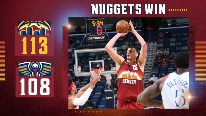 掘金(27-18):约基奇37分6篮板9助攻,穆雷23分3篮板11助攻,波特25分5篮板,米尔萨普16分7篮板3助攻,巴顿5分2篮板3封盖,格林2分4篮板。