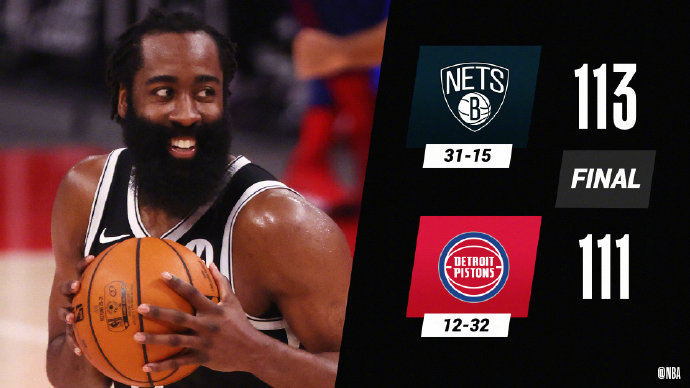 篮网(31-15):哈登44分14篮板8助攻,格里芬17分3篮板2助攻,哈里斯9分2篮板3助攻,小乔丹10分9篮板,布朗7分2篮板1助攻,泰勒-约翰逊8分3篮板2助攻,鲁瓦乌7分6篮板,杰夫-格林5分3篮板,克拉克斯顿3分5篮板