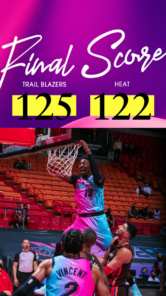 JRS直播网3月26日讯 NBA常规赛,热火主场迎战开拓者,热火最近已经4连败掉落至东部第5位,开拓者也是2连败排在西部第6位,但交易截止日刚刚过去,因涉及到伤病、交易等,热火巴特勒等多名球员本场缺战。开局上来开拓者打出10-2开局建立优势,麦科勒姆也是手感火热连续砍分,开拓者在麦科勒姆单节21分的带领下首节结束领先7分,次节热火三分手感不错将分差反超,随后双方展开拉锯战,半场结束热火只落后1分。下半场双方还是非常胶着的拉锯战,你进一个我还一个,麦科勒姆状态依然不错,热火众将也能回应上,三节结束双方打平,末节热火突然找到外线手感连续扔进5记三分一举建立优势,但利拉德带领打出一波11-0又将比分反超回来,最后时刻双方连续打成,比分交替领先,利拉德三分造犯规罚球绝杀,开拓者险胜热火,送给对手5连败。