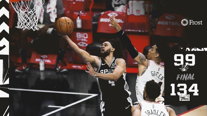JRS直播网3月15日讯 NBA常规赛继续进行,76人主场迎战马刺。76人目前高居东部第一,球队也在上一场比赛中大胜奇才取得四连胜,但当家球星恩比德的受伤给胜利蒙上了一层阴影,好在恩比德此次伤病并不严重,据消息称2-3周后即可复出。马刺目前位列西部第七,阿尔德里奇已和球队达成协议不再出战,德罗赞也因个人事务缺阵。本场西蒙斯迎来复出。一开场,面对旧主的丹尼-格林毫不手软,4投全中独得11分,帮助76人领先11分结束首节。次节比赛马刺奋力反击一度把分差缩小到4分,西蒙斯连续得分帮助球队稳住局势,半场打完76人60-52领先马刺8分。易边再战,76人火力全开,马刺无力招架,波波维奇五上五下也于事无补,马刺完全被打散,76人单节拿到46分,领先33分进入末节。末节彻底沦为垃圾时间,但76人势头不减三分连续命中,最终76人主场大胜马刺,喜获五连胜。