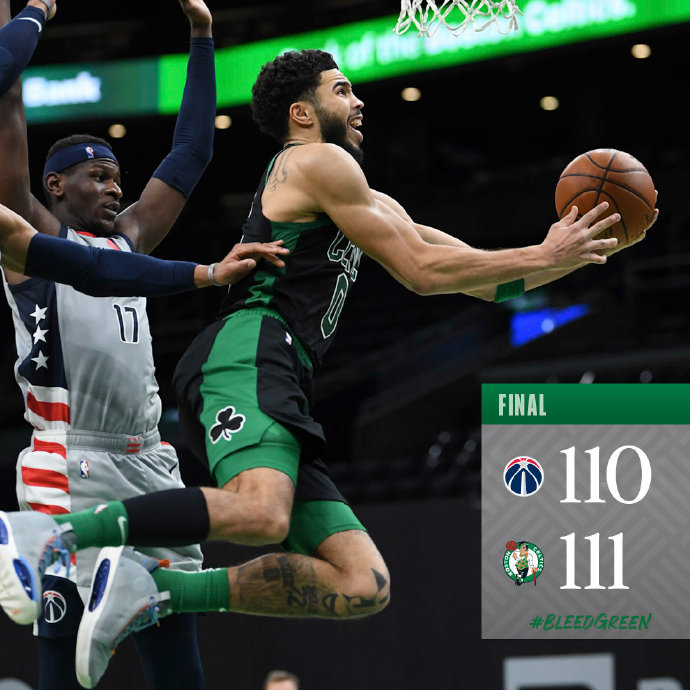 JRS直播网3月1日讯 NBA常规赛,凯尔特人坐镇主场迎战奇才,前者上一场击败了步行者结束连败,后者则正在经历两连胜,此役布朗因伤缺阵。首节开局凯尔特人一波7-0取得领先,奇才通过造杀伤在罚球线缩小分差,塔图姆和贝尔坦斯互相回应三分球,两队陷入拉锯战,次节塔图姆延续良好手感,奇才则由比尔连续打中紧咬比分,半场凯尔特人60-55领先五分。下半场风云突变,绿军打成一波小高潮拉大分差,随后进攻效率下降,奇才不断蚕食分差,三节结束时追到只差三分,末节绿军进攻依然不理想,奇才众人发力很快获得反超,这时泰斯站出来连得八分稳住局面,随后双方进入球星对飙,比尔连续打中帮助奇才扩大分差,凯尔特人稳扎稳打迫近比分,还是比尔站出来连传带攻使奇才占据主动,塔图姆两记突破后又造成比尔失误,杀进禁区再中获得反超,比尔绝杀不中,凯尔特人111-110险胜奇才。
