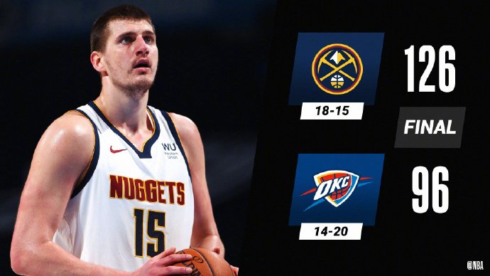 JRS直播网2月28日讯 掘金今日前往俄城挑战雷霆,双方前两次交锋都以掘金的胜利告终,此役他们也是势在必得。首节比赛,雷霆攻防两端全部掉链子,掘金上来就反客为主奉上13-0的攻击波,波特单节三分4中4砍下14分,在他和约基奇的带领下掘金全队火力全开,很快便确立了18分的领先优势。次节雷霆利用对手主力下场的间隙,靠着杰罗姆、K-威廉姆斯等人的努力一度将分差迫近到11分,但当掘金主力重回场上后,局势再次失控,掘金送出18-5的攻势将分差拉大到22分。第三节雷霆外线依旧失准,防守端霍福德又被约基奇完全压制,约老师两节半即砍下三双,掘金多点开花一举确立了30分的领先优势。末节因为分差过大,两队早早撤下主力开始练兵,比赛彻底失去悬念,最终掘金客场126-96击败雷霆。