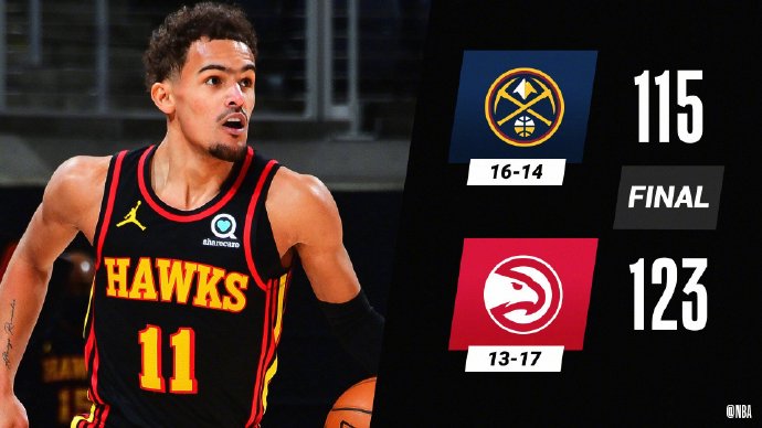 JRS直播网2月22日讯 老鹰今日坐镇主场应战掘金,伤兵满营的老鹰近来状态不佳,近6场比赛输了5场,掘金这边穆雷则状态爆表,上一场爆砍50分率队取胜。首节约基奇十分低迷,仅仅依靠罚球得到1分,好在掘金角色球员给力,波特和波尔联手轰下15分帮助球队确立了6分的领先优势。次节加里纳利率领一众替补们打出一波13-0一举将比分反超,掘金则依靠巴顿和莫里斯勉力支撑,怎料许尔特和特雷-杨上场后又是一波15-3的攻击波,老鹰半场已然反超8分。第三节,特雷-杨开始自己的表演,连续两记超远三分点燃全场激情,单节爆砍14分,再加上卡佩拉肆虐篮下,掘金彻底被打懵,分差也被拉大到17分。末节,掘金在穆雷的带领下不断蚕食分差,无奈之前挖的坑太大,特雷-杨上场后重新掌握场上主动权,最终老鹰以123-115击败掘金。