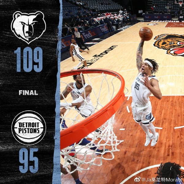 JRS直播网2月20日讯 排名东部垫底的活塞队客场挑战西部第九灰熊队,此役主队狄龙-布鲁克斯因伤缺阵,深陷交易传闻的活塞前锋格里芬也并未出战。首节比赛,灰熊利用主场优势多点开花,安德森、莫兰特、瓦兰、阿伦均有得分进账,活塞格兰特、约什-杰克逊外线颗粒无收,分差迅速被拉开,第一节结束时灰熊35-17领先18分。次节比赛活塞状态有所回暖,赖特和萨迪克-贝带领活塞打出10-0的进攻高潮缩小分差,灰熊本节命中率有所下降,半场结束时53-43领先10分。易边再战,萨迪克-贝个人连中三记三分,活塞迅速缩小分差,莫兰特连突带投帮助灰熊稳住阵脚,三节比分灰熊84-73活塞。末节开始,赖特里突外投连得7分后因伤退场,活塞一度把分差迫近到只剩1分。贝恩连得5分,莫兰特更是攻防两端碾压史密斯,个人连得8分将分差拉开到15分,最终灰熊109-95主场拿下胜利。