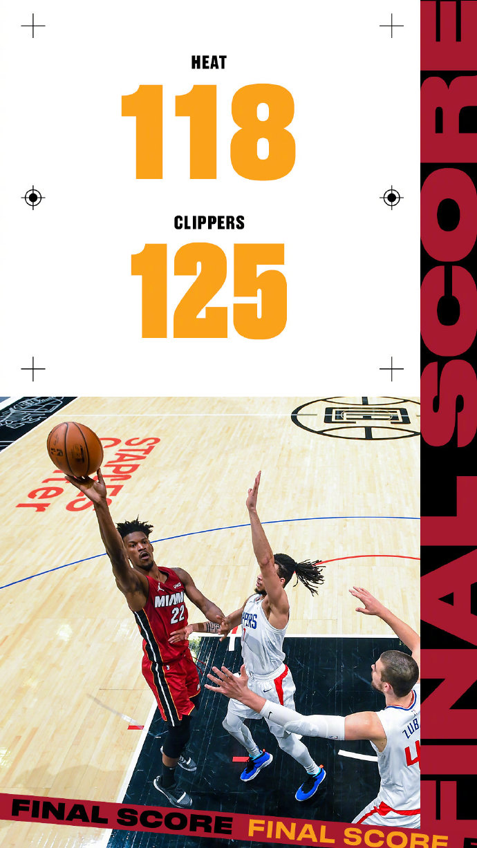 热火:纳恩分板助,巴特勒分板助,邓罗分板助,奥利尼克分板助,阿德巴约分板助,希罗25分5板2助