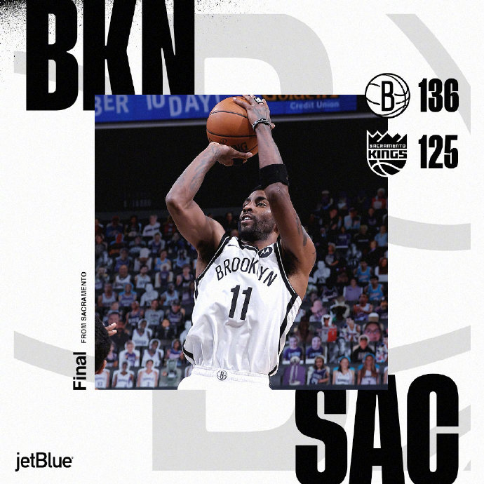 JRS直播网2月16日讯 NBA常规赛,篮网前往客场挑战国王。两连胜的篮网稳居东部第3,而国王则近况糟糕,遭遇了三连败跌至西部第11位。上半场两支球队状态相当一路僵持,欧文开局连续命中两记三分,国王多点开花,首节篮网落后国王1分,次节上来哈登里突外投连续得分帮篮网取得短暂领先,但国王一直顽强追分并未使分差被拉大,半场结束篮网领先国王6分。下半场经过短暂僵持,篮网突然爆发,哈登欧文连续拿分率领篮网打出一波20-0拉开分差。末节篮网持续保持大比分领先,但顽强的国王通过一波13-0一度将分差缩小到15分,但无奈分差过大篮网没有继续给对手机会,最终篮网136-125战胜国王斩获三连胜。