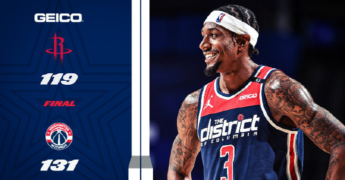 JRS直播网2月1日6讯 奇才坐镇主场迎战火箭,此役戈登、塔克、奥拉迪波和伍德均因伤缺阵,本场比赛是沃尔被交易后首次回到华盛顿。首节沃尔打满12分钟独砍18分,但比尔里突外投频频得分回敬,贝尔坦斯替补上场连中三分,奇才得以稍稍领先结束首节。沃尔在次节延续状态一度率队反超比分,不过比尔再度站出来得分还以颜色,贝尔坦斯再连中三分,奇才以72-69继续压制火箭结束半场。易边再战,火箭命中率下滑,而奇才则保持着良好手感,比尔带队打出高潮建立起两位数领先。末节火箭未能打出有效的追分攻势,比尔和威少带领奇才把优势维持到终场。最终,奇才在主场以131-119复仇火箭,取得2连胜,同时送给火箭6连败。