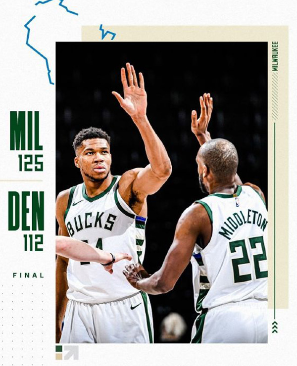 雄鹿(15-8):米德尔顿29分8板12助攻3断,字母哥30分9板3帽,大洛13分7板,迪文岑佐13分7板3断2帽,福布斯15分5板,克雷格9分5板,波蒂斯7分6板,奥古斯丁5分5助。