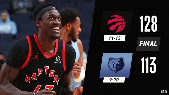 猛龙(11-13):范弗里特32分3篮板9助攻,西亚卡姆32分5篮板6助攻,鲍威尔29分,贝恩斯7分6篮板3助攻,布歇12分10篮板,本布里6分2篮板。