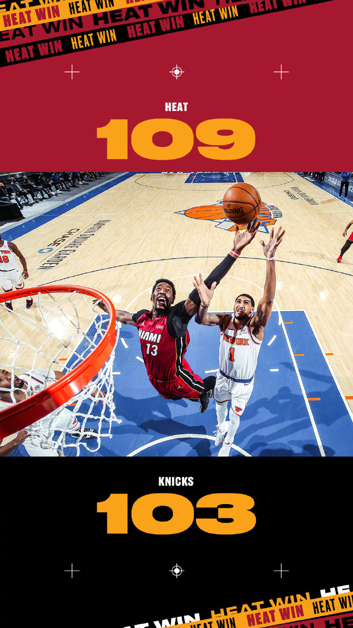 JRS直播网2月8日讯 NBA常规赛尼克斯主场对阵热火,尼克斯近来取得2连胜,热火则是仅排在东部倒数第三。开场后布洛克就手感火热连中三分帮助尼克斯取得领先,不过热火逐渐打出气势完成反超,第二节场上局势仍旧胶着,虽然尼克斯一度掀起反扑完成反超,但是阿德巴约和巴特勒仍旧帮助热火以60-59领先1分结束上半场。下半场回来两队手感再次回落,不过热火仍旧靠着三分稍稍拉开比分,虽然尼克斯穷追不舍,不过关键时刻巴特勒和阿德巴约仍旧帮助热火锁定胜局,最终热火109-103力克尼克斯。