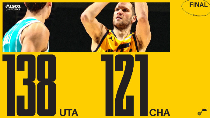爵士(18-5):博格达诺维奇31分7板5助、米切尔30分3板5助、康利16分4板2助、奥尼尔9分2助、戈贝尔12分15板4帽、英格尔斯10分4板11助、克拉克森15分3助、费沃斯7分7板3助2断3帽、尼昂5分2板、奥尼3分。