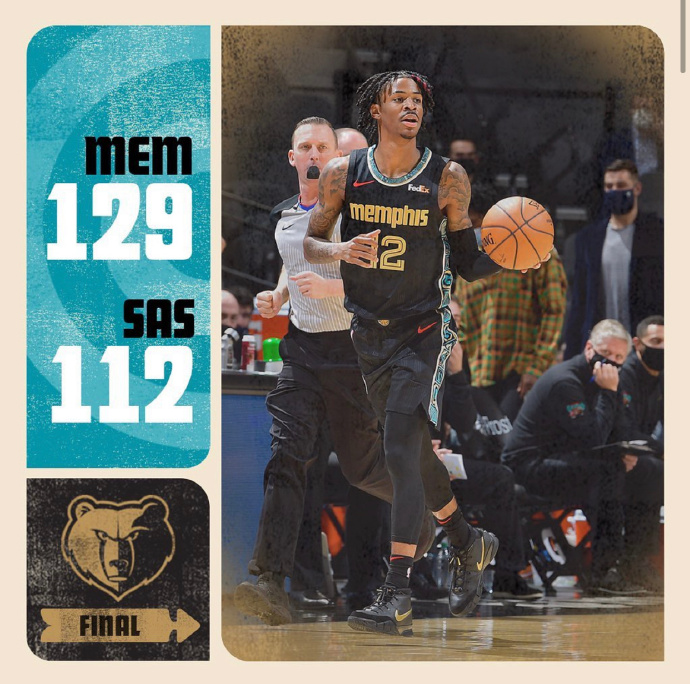 JRS直播网1月31日讯 NBA常规赛迎来西南区内战,近来攀升至西部第四的马刺迎战灰熊,后者在多场比赛延期后迎来近两周首战,首节一上来两队外线火热对飚,莫兰特极限拉杆打成2+1,首节结束后灰熊领先8分,次节回来后双方你来我往陷入缠斗,末段灰熊多点开花再次占据优势,半场战罢,灰熊继续领先7分。易边再战后莫兰特火力全开,本节他率队守住优势,三节结束后灰熊依然领先10分,末节决战,马刺追分乏力,最终灰熊129-112大胜马刺。