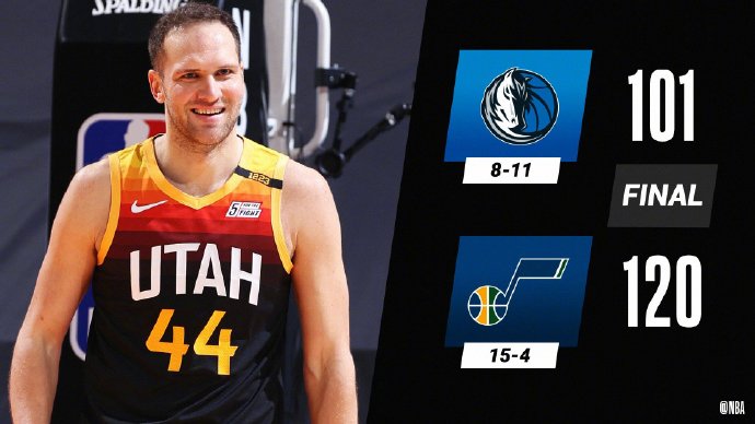 爵士(15-4):博格达诺维奇32分2助攻,戈贝尔17分12篮板2封盖,康利22分9助攻3抢断,英格尔斯10分4篮板4助攻,克拉克森18分6篮板,摩根12分7篮板3抢断,奥尼尔4分11篮板2封盖。