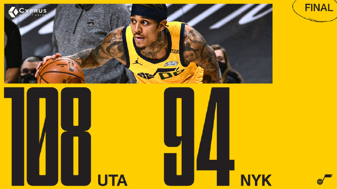 JRS直播网1月27日讯 爵士坐镇主场迎战尼克斯,上半场尼克斯杀出奇兵,替补上场的小里弗斯里突外投独砍25分,率领尼克斯在半场战罢以59-46建立起两位数领先。易边再战,爵士找到手感,康利、博格丹诺维奇和米切尔等连中三分,爵士凭借这波三分雨抹掉分差。末节爵士延续手感火热手感,奥尼尔等连续得分,帮助球队反超比分。而尼克斯则命中率暴跌,整个下半场仅得到35分。最终,爵士以108-94逆转尼克斯,豪取9连胜,同时送给尼克斯3连败