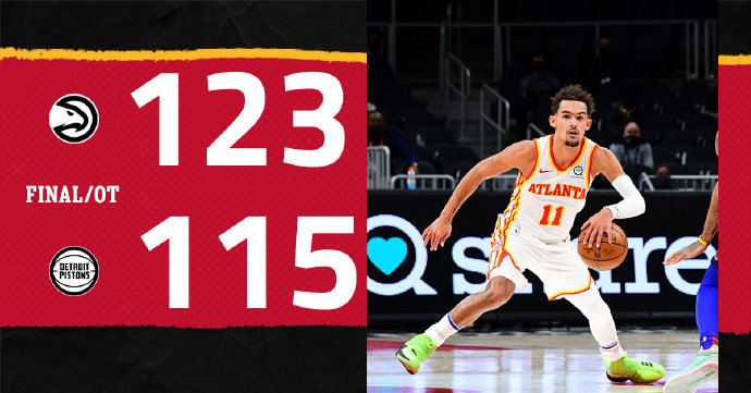 JRS直播网1月21日讯 NBA常规赛活塞对阵老鹰,开场后两队主攻内线连续打平,此后虽然活塞外线找到手感,不过老鹰也紧咬比分,第二节卡佩拉篮下发挥强势帮助老鹰一度反超比分,不过活塞及时稳住局势仍旧以52-45领先结束上半场。下半场虽然特雷-杨火力全开为老鹰追分,并且他们一度将分差缩小到只差3分,但活塞三节结束前打出一波11-0的高潮将分差拉大到两位数,第四节两队进攻都手感不佳,特雷-杨在最后时刻连续制造犯规犯规追分并且助攻卡佩拉空接扳平比分,两队进入加时大战。加时赛中老鹰发挥更胜一筹,最终老鹰加时123-115逆转活塞。