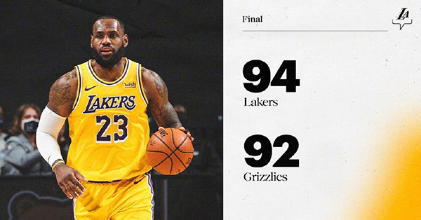 JRS直播网1月6日讯 NBA常规赛湖人对阵灰熊,湖人近来状态不错取得3连胜。开场后湖人利用快攻抢占先机,首节两队手感都比较一般,灰熊冲击内线追上比分,吉昂和蒂尔曼帮助球队完成反超。第二节上来湖人外线连中三分,接着场上局面陷入僵持,两队球队轮番打出表现,上半场结束时灰熊49-45领先湖人。下半场两队两队手感仍旧一般,詹姆斯一度帮助湖人反超比分,不过灰熊及时调整咬住比分,第四节场上局面仍旧胶着,最后关头詹眉两人先后发力在攻防两端帮助湖人锁定胜局,最终湖人力克灰熊取得4连胜。