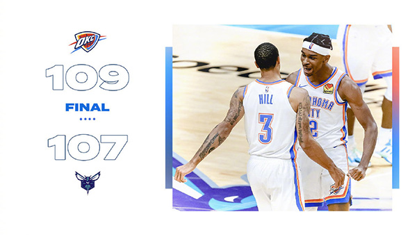 JRS直播网12月27日讯 NBA常规赛雷霆客场挑战黄蜂,这是雷霆新赛季第一场正式比赛。开场后两队就打得个势均力敌,鲍尔一扫上场比赛颓势在首节就表现不错,第二节格拉汉姆突然爆发帮助黄蜂一度领先到11分,但是希尔和亚历山大帮助雷霆追上比分,半场打完,黄蜂59-57领先雷霆。下半场回来黄蜂进攻乏力,虽然雷霆进攻也比较一般但仍旧完成反超,最后一节雷霆依靠三分线外的不错手感将领先巩固在两位数,但是最后时刻布里奇斯三个三分帮助黄蜂在9.7秒的时候追平比分,亚历山大晃开防守跳投命中,最终雷霆109-107击落黄蜂取得赛季开门红。