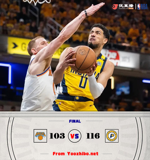 JRS直播网5月18日讯 步行者今日坐镇主场迎来和尼克斯的G6之战,尼克斯上一场击败步行者后夺得赛点。首节开局双方都不敢大意,整个第一节最大分差不过5分但也很快被抹掉;布伦森开局上来就连中两粒进球,然而这是他上半场的全部运动战进球,随后遭到重点关照的他11次出手全部偏出,好在麦克布莱德连续飙进三分为球队续上火力;步行者这边的打法更全面几乎登场球员就有贡献;这波拉锯一直持续了一节半的时间,次节后半段尼克斯突然熄火,步行者抓住机会送出17-2的攻势一举拉开10分领先结束上半场。休息归来布伦森状态有所回暖但防守端已经无力限制对手,步行者这边多点开花完全掌控局势,末节开局步行者送上11-4的攻势将分差拉大至20分奠定胜局。最终,步行者主场以116-103轻取尼克斯将比赛拖入抢七大战。