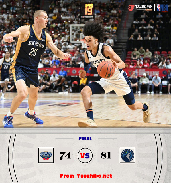 JRS直播网讯 7月13日NBA夏季联赛,鹈鹕对阵森林狼。森林狼球星唐斯和鹈鹕新援德章泰-穆雷均到现场观战。比赛开始,鹈鹕连投带罚先拿5分,森林狼一波9-0强势回应,此后双方陷入缠斗,比分交替领先,次节森林狼持续发力再度完成9-0的攻击波取得两位数优势,鹈鹕不断冲击篮筐频频得手迅速追赶,半场战罢鹈鹕40-45落后森林狼5分。易边再战,鹈鹕一波6-0很快反超,森林狼连投带罚稳住局势,末节鹈鹕内外开花再度反超,双方争夺陷入白热化,关键时刻香农持续发力帮助森林狼确立优势,鹈鹕苦苦追赶无果。最终,森林狼81-74力克鹈鹕。