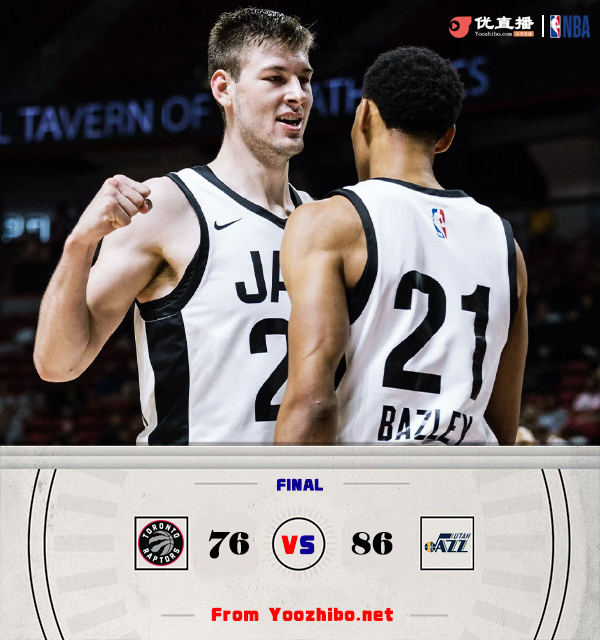 JRS直播网7月17日讯 NBA夏季联赛,爵士主场对阵猛龙。爵士选秀大会上主要摘得10号秀科迪-威廉姆斯、29号秀科利尔和32号秀菲利波夫斯基;猛龙则是19顺位选中沃尔特,31顺位选中莫格博,45顺位拿到谢德。比赛开始,爵士上来比较慢热,猛龙抓住机会打出7-0开局,亨德里克斯里突外投止血,随后2分钟内猛龙再打10-0建立主动权,亨德里克斯又是连追5分,首节爵士仅落后2分,次节猛龙打了3分多钟仅得2分,爵士一波小高潮反超比分,随后爵士接连外线发炮,单节23-10直接领先到11分。下半场,菲利波夫斯基接连取分,亨德里克斯继续保持自己的好状态,而猛龙则是利伯蒂苦苦支撑,三节爵士领先到17分,末节双方展开拉锯战,猛龙后半节一波9-0追至个位数分差,金西暴扣止血,爵士还是掌握住10分左右领先,最终爵士86-76力克猛龙。