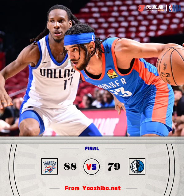 JRS直播网 7月21日讯 NBA夏季联赛,雷霆对阵独行侠。雷霆选秀大会上摘到12号秀托皮奇、26号秀琼斯和38号秀米切尔。比赛开始,双方进入状态都不快,打了3分多钟各自仅拿到4分,威利接连内线打成帮助独行侠一波10-0进攻波一举确立领先,但雷霆接连造杀伤回应9-2追到差4分,次节双方你来我往展开拉锯战,雷霆多次追平比分但独行侠都能回应,双方次节打成22平,半场独行侠还领先4分。下半场双方上来接连打铁,凯利暴扣打破僵局,劳森反击立马回应,随后独行侠突陷得分荒,最后两分钟雷霆一波15-3攻击波一举反超9分,末节伯海姆三分助雷霆领先双位数,双方围绕10分左右分差展开拉锯战,普罗斯珀三分追到差5分,但独行侠连续失误,最终雷霆88-79力克独行侠。