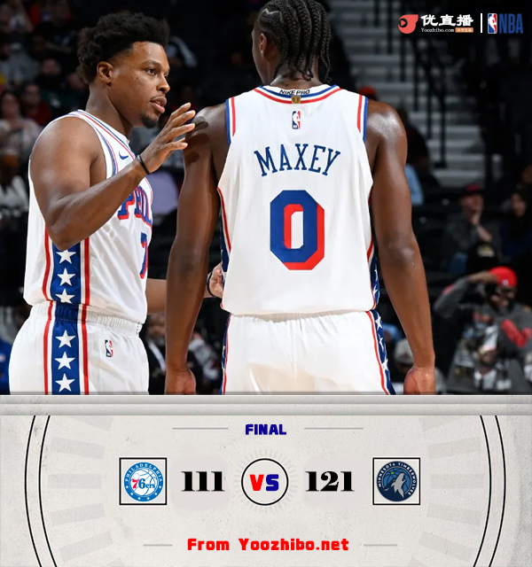 JRS直播网10月12日讯 NBA季前赛,森林狼对阵76人。76人新援乔治迎来首秀,恩比德缺阵。比赛开始,森林狼率先发力取得领先,76人内外开花努力追赶,次节76人进攻断电,森林狼一波15-4一度获得20分的优势,乔治独中3记三分艰难止血,半场战罢森林狼70-53领先76人。易边再战,马克西和乔治联手带队缩小分差,76人一度将比分迫近到只剩3分,此后双方均使用轮换阵容,末节双方陷入缠斗,比分咬得很紧,关键时刻森林狼连续拿分锁定胜局。最终,76人111-121不敌森林狼。