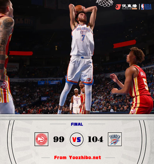 JRS直播网10月18日讯 NBA季前赛,老鹰对阵雷霆,本场比赛老鹰主力休战,雷霆则是亚历山大和杰伦-威廉姆斯领衔先发。比赛开场后雷霆多点开花取得领先,并且一度领先到两位数老鹰依靠三分追赶比分,首节后半段雷霆命中率下降,老鹰冲击内线完成反超,巴夫金状态火热接连拿分。第二节雷霆上来打出一波11-0的攻势夺回另外,随后老鹰连续拿分做出回应,杰伦-威廉姆斯崴脚离场,两队你来我往陷入僵持。下半场回来雷霆也主要安排替补阵容出战,场上局面依旧十分胶着。最后一节两队依旧是拉锯战,雷霆始终保持微弱优势,老鹰最后采用犯规战术也未能上演奇迹,最终雷霆104-99力克老鹰。