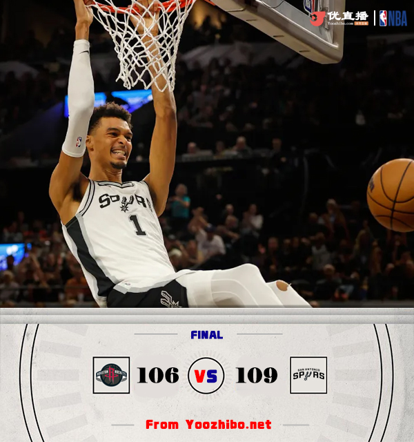 JRS直播网10月27日讯 NBA常规赛继续进行,马刺在德州内战中主场面对火箭,火箭目前1胜1负,而马刺揭幕战不敌独行侠无缘首胜。此役一上来文班手感在线连中三分,杰伦-格林连投带罚不断回应,两队外线火热对飚,末段索汉连续冲击内线得手,首节结束时马刺确立7分优势,次节回来,火箭进攻断电单节仅得到10分,9分07秒内一分未得,文班延续状态率队顺势拉开比分,半场战罢,马刺已经领先21分。易边再战后马刺进攻停滞,火箭状态回暖不断追分,凯尔登杀伤内线稳住局势,文班压哨长两分打进,马刺带着18分优势进入末节,末节上来,火箭内外开花连续打出追分高潮,双方分差一度只剩1分,但文班联手索汉及时止血,决胜时刻马刺连中罚球,杰伦-格林绝平三分不中,最终马刺109-106险胜对手迎赛季首胜。