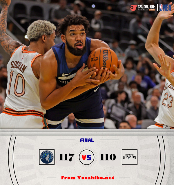 JRS直播网11月11日讯11月11日讯 NBA常规赛西部季中锦标赛,马刺今日迎战森林狼,前者近来遭遇三连败状态不佳,后者则是取得四连胜势头正佳。比赛上来,马刺就率先进入状态打出9-2的完美开局取得领先,整个第一节森林狼都处于落后,次节森林狼的进攻逐渐打开,比分也是追了回来,两队开始展开拉锯,半场结束时森林狼反超2分;下半场回来,森林狼占据了场上的主动权,分差迅速达到了两位数,三节结束时马刺已经落后17分,末节马刺虽然有反扑的势头但终究未能完成逆转,最终森林狼力克马刺,迎来五连胜的同时也送给后者四连败。