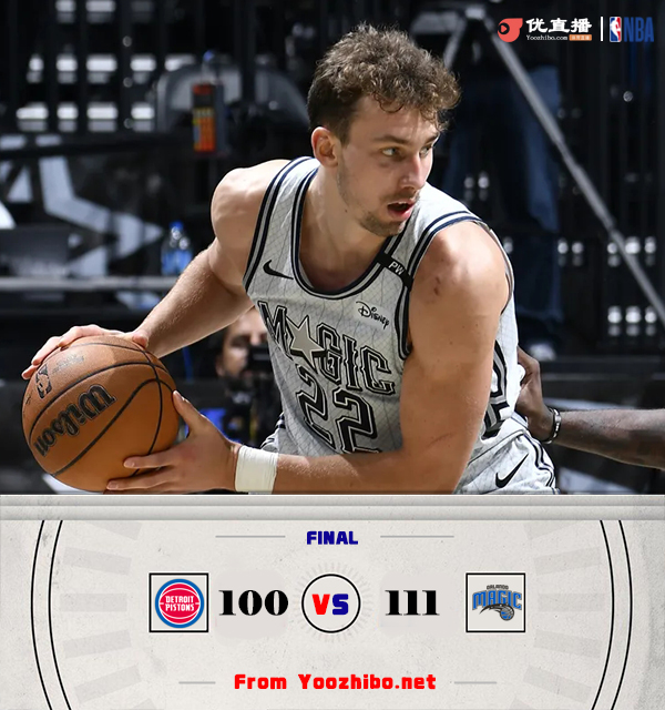 JRS直播网讯北京时间11月24日讯 NBA常规赛,魔术主场迎战活塞。魔术10胜7负高居东部第三,活塞7胜10负排东部第八,康宁汉姆因伤缺阵。上半场,小瓦格纳率先发力,内外开花很快帮助球队取得两位数领先,次节魔术命中率下降,活塞内外开花不断迫近比分,萨格斯因伤退赛,半场战罢魔术56-53活塞。下半场,活塞先中三分扳平比分,此后双方陷入缠斗,小瓦格纳连得9分带队重获两位数优势,末节魔术占得先机打出9-2扩大领先,活塞苦苦追赶无果。最终,魔术111-100击败活塞,主场过关。