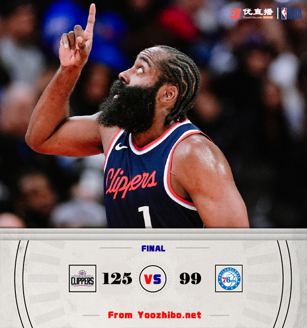 JRS直播网讯北京时间11月25日讯 NBA常规赛,快船对阵76人,快船最近状态不错取得4连胜,76人上场比赛击败篮网,恩比德和乔治继续缺阵。开场后快船在哈登的带领下内外开花早早建立起两位数优势,哈登手感不错单节轰下12分,76人开局手感不佳到了第一节后半段才逐渐找到手感。第二节快船进攻命中率也开始下降,主要是哈登手感下降,两队单节打成平手。易边再战,哈登再度带领快船打出攻势将分差拉大,场上分差一度达到33分。76人虽然再度后程发力追回一些分数,但第四节快船再度掌控场上局面,最终快船125-99轻取76人收获5连胜。