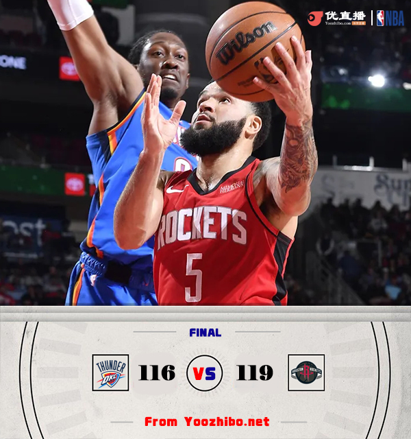 JRS直播网讯北京时间12月2日讯 NBA常规赛,火箭主场迎战雷霆,西部第一和第二迎来直接交锋。比赛开始,双方开场便陷入缠斗,比分交替领先,火箭多点开花,雷霆里突外投给出回应,次节火箭将分差拉开到两位数,雷霆连中三分还以颜色,范弗里特连得8分,半场战罢火箭62-60领先2分。易边再战,两队依旧打得难解难分,雷霆持续发力打出9-0的攻击波完成反超,末节火箭扳平比分,此后双方争夺陷入白热化,范弗里特连中三分,华莱士三分给出回应,狄龙和亚历山大抢球引发冲突,但狄龙争得关键球权且命中压哨,火箭119-116雷霆险胜过关。