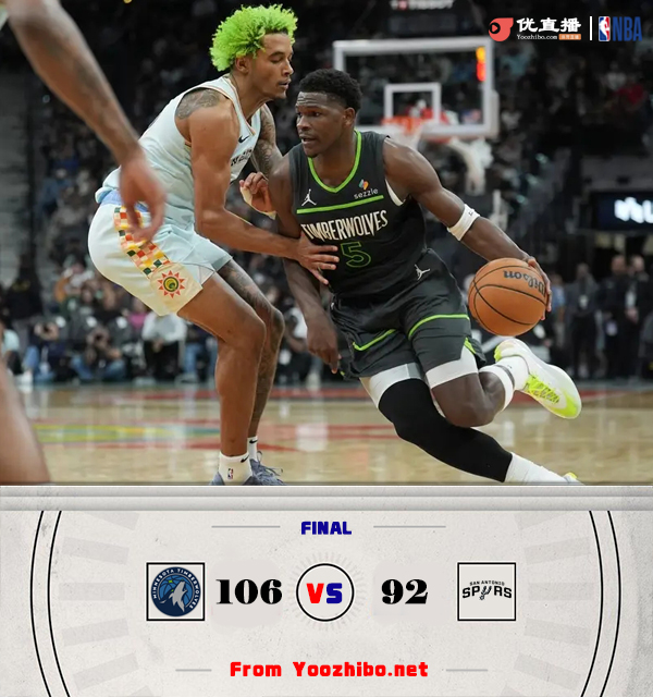 JRS直播网讯北京时间12月16日讯 NBA常规赛激战正酣,马刺主场迎战森林狼,文班和爱德华兹两位新星率队出击,森林狼目前13胜11负排在西部第7,马刺迎来连胜后战绩来到13胜12负,仅落后森林狼半个胜场位列西部第11位。首节争夺马刺稍显慢热,爱德华兹里突外投率先发力,率领森林狼早早确立优势,文班联手索汉及时止血,但森林狼多点开花牢牢占优,首节结束时森林狼领先9分,次节回来,马刺进攻再度停滞单节仅得到18分,文班连投带罚苦苦支撑,森林狼延续火力内外开花,半场战罢,森林狼已经领先15分。易边再战后马刺找到进攻感觉,巴恩斯连中三分率队追分,三节结束后马刺将分差缩小至6分,末节决战,森林狼再度发力扩大优势,爱德华兹拉开单打连拿6分,双方分差来到20分,比赛提前失去悬念,最终森林狼106-92力克马刺。