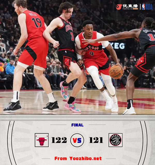JRS直播网讯北京时间12月17日讯 NBA常规赛,公牛对阵猛龙,公牛上场比赛击败黄蜂,猛龙最近遭遇4连败,本场比赛拉文缺阵。开场后猛龙抢占先机,但没有多久武切维奇和怀特就帮助公牛反超比分,随后公牛通过外线三分扩大优势。第二节,巴雷特和迪克轮番冲击内线帮助猛龙追分,不过公牛多点开花牢牢守住优势。易边再战,两队依旧是拉锯战,第三节后半段公牛轮换阵容全面开花将分差拉大到两位数,基迪受伤离场。第四节,猛龙后程发力,依靠迪克和阿巴基一路将比分追上,关键时刻鲍尔命中三分,猛龙始终差一口气。最终公牛122-121送给猛龙5连败。
