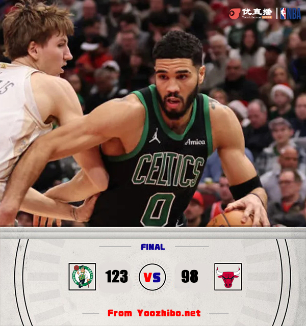 JRS直播网讯 北京时间12月22日讯 NBA常规赛激战正酣,凯尔特人前往客场再战公牛,上场公牛客场击败对手迎来三连胜,凯尔特人主帅马祖拉赛后不满判罚怒喷主裁被罚款3.5万美元。此役一上来双方便陷入缠斗,布朗率先发力不断取分,公牛内外结合及时回应,两队你来我往比分始终紧咬,首节战罢双方战成28平,次节回来,公牛开局进攻出现停滞,凯尔特人持续发力,并在末段轰出10-0攻击波拉开比分,半场战罢,凯尔特人确立7分优势。易边再战后塔图姆连中三分狂揽18分,凯尔特人延续火力将分差越拉越大,三节结束后凯尔特人已经领先16分,末节上来,公牛进攻滞涩追分乏力,塔图姆手感滚烫提前终结悬念,双方早早换上替补阵容,最终凯尔特人123-98大胜公牛成功复仇。