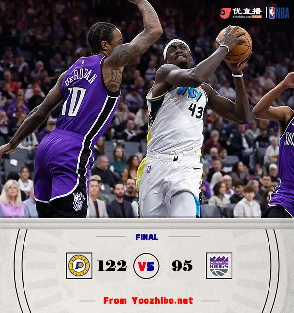 JRS直播网12月23日 NBA常规赛,国王主场迎战步行者。国王3连败排西部第十二,步行者3连胜列东部第八。比赛开始,双方开场势均力敌,比分交替领先,次节双方依旧打得难解难分,国王内外开花,步行者不断冲击内线拿分强势回应,两队你追我赶,半场战罢战成52平。易边再战,步行者持续发力,多点开花取得两位数领先,末节国王彻底断电,步行者轰出24-7将分差拉开到20分以上杀死比赛。最终,步行者122-95轻取国王,取得4连胜的同时送给国王4连败。