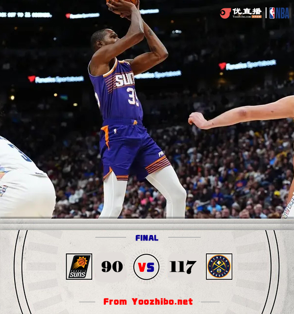 JRS直播网12月24日讯 NBA常规赛,太阳对阵掘金,太阳最近遭遇2连败,球星布克还缺阵,掘金上场比赛加时力克鹈鹕,本场比赛穆雷缺阵,威少先发出战。开场后太阳多点开花抢占先机,杜兰特和比尔轮番砍分,掘金在约基奇的带领下连续做出回应,小波特一扫上场比赛颓势找回火热状态。第二节上来掘金率先打出攻势建立起10分领先,杜兰特挺身而出再次用自己的得分能力帮助太阳回应一波11-0的反扑,约基奇毫不示弱跟杜兰特对飚得分。易边再战,杜兰特命中率开始下降,不过比尔站出来单节砍下13分,但太阳防守端完全无法限制掘金,约基奇单节也是拿到13分,在他带领下掘金多点开花单节轰下45分将比分拉开。最后一节太阳攻防两端依旧表现不佳,第四节刚过半就撤下主力宣告放弃,最终掘金117-90送给太阳3连败。