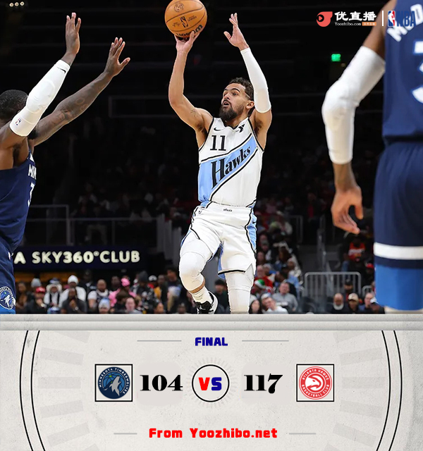 JRS直播网讯北京时间12月24日讯 NBA常规赛,森林狼对阵老鹰,两队最近表现都不理想,森林狼遭遇2连败,老鹰遭遇3连败。上半场两队各打一节好球,首节特雷-杨展现火热手感连连拿分,老鹰外线下起三分雨,首节便领先16分。但第二节,森林狼的轮换阵容在里德和迪文岑佐的带领下也是火力全开,老鹰则进攻准心不再,里德一度崴脚离场,森林狼单节净胜19分将比分反超。下半场回来两队陷入僵持,丹尼尔斯防守端表现给力多次贡献抢断,但森林狼进攻也打得火热。最后一节森林狼准信再度丢失,老鹰在特雷-杨的带领下趁势将比分拉开,最终老鹰117-104击败森林狼结束3连败,森林狼遭遇3连败。