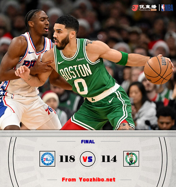 JRS直播网讯12月26日NBA圣诞大战,凯尔特人主场迎战76人,凯尔特人目前22胜7负高居东部次席,76人则是10胜17负排在东部第12位。本场比赛,霍勒迪缺阵。比赛开始,双方上来就下起三分雨,马克西里突外投迅速上双,恩比德接连内线强打建立主动权,但绿军依然靠三分回应,首节76人领先5分,次节双方再次三分对飚,马克西有攻有传带队15-2攻击波扩大到双位数领先,塔图姆里突外投连砍9分带队追分,恩比德接连中远投强势回应8分,半场76人还领先8分。下半场,双探花联手7-0追分,随后76人进攻端受阻,杰伦-布朗里突外投单节砍下14分助队直接反超比分,三节双方打成82平,末节马克西里突外投加助攻凯莱布-马丁三分,带领76人轰出18-2重新取得领先,塔图姆带队连续强杀回应11-0咬住比分,恩比德联手马克西止血,76人重新领先到两球以上,乔治和恩比德两罚全中杀死比赛,最终76人118-114力克凯尔特人。