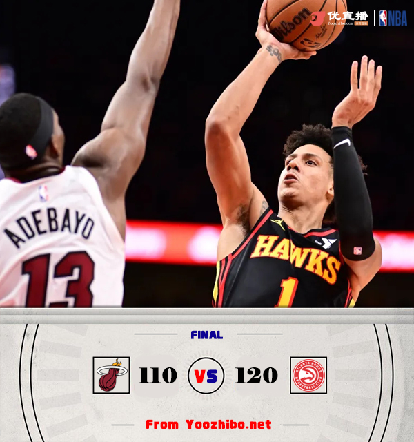 JRS直播网讯北京时间12月29日讯 NBA常规赛,老鹰主场迎战热火,老鹰目前16胜15负东部第7,热火则是15胜13负东部第6,两队目前都是2连胜。本场比赛,巴特勒继续缺阵。比赛开始,双方上来有来有回节奏很快,吹杨接连助攻,老鹰亨特和马修斯撑起替补,联手扔进4记三分,随后老鹰一波9-2领先7分,次节双方展开拉锯战,热火外线接连三分一度反超比分,但老鹰总是全民皆兵能回应,半场老鹰领先3分。下半场,热火上来8-2小高潮再次咬住比分,但马修斯和亨特还能接连三分回应守住领先,希罗里突外投带队继续追分,但老鹰总能回应三节领先9分,末节罗齐尔助热火继续追分,老鹰还是能回应守住微弱领先,比赛很快进入白热化,热火连续三分不中,老鹰接连走上罚球线,杰伦-约翰逊三分再中一波9-0杀死比赛,最终老鹰120-110力克热火,拿到3连胜。