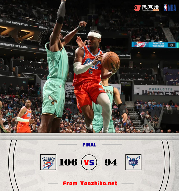 JRS直播网讯北京时间12月29日讯 NBA常规赛,雷霆客场挑战黄蜂。雷霆9连胜高居西部第一,黄蜂6连败排东部第十三。上半场,雷霆率先发力,连中三分打出15-5的开局,黄蜂不断冲击内线努力追赶,米西奇连中三分不断缩小分差,雷霆内外开花保持优势,亚历山大得分助攻一肩挑,半场雷霆61-46领先黄蜂。下半场,雷霆稳扎稳打保持优势,黄蜂里突外投苦苦支撑,末节黄蜂占得先机迫近比分,雷霆多点开花稳住局势,黄蜂大势已去。最终,雷霆106-94击败黄蜂,豪取10连胜。