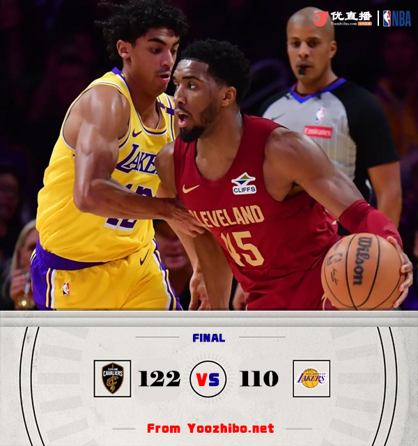 JRS直播网1月1日讯 NBA常规赛迎来焦点大战,湖人主场迎战7连胜的联盟领头羊骑士,詹姆斯40岁后首战老东家,湖人新援芬尼-史密斯和米尔顿迎来首秀,骑士本赛季面对西部球队8连胜。此役一上来詹姆斯外线早早开张,里夫斯与浓眉杀伤内线,但米切尔率队多点开花率先占优,中段骑士抓住机会开始发力,首节结束时骑士领先4分,次节回来,骑士进攻稍有停滞,詹姆斯两分打进后湖人一度反超,不过骑士迅速调整状态,内外结合一波9-0夺回优势,半场战罢,骑士继续领先5分。易边再战后两队陷入鏖战,浓眉予取予求持续发威,里夫斯串联全队,中段湖人回敬10-0小高潮打停对手,勒韦尔和米切尔连中三分稳住局势,三节结束后骑士保持9分优势,末节决战,里夫斯连续杀伤狂揽17分,詹姆斯与浓眉续上火力,湖人没有放弃苦苦追分,但骑士顶住压力,最终122-110击败湖人迎来8连胜。