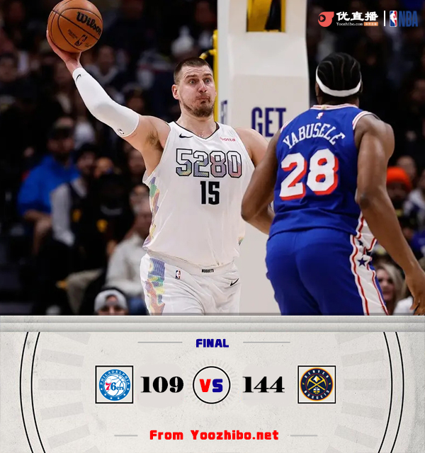 JRS直播网讯 北京时间1月22日讯 NBA常规赛,掘金主场迎战76人。掘金26胜16负稳居西部第四,76人15胜26负排东部第十一,近期更是遭遇6连败。恩比德继续缺阵。一开场,双方短暂相持,随后掘金内外开花一举取得两位数优势,乔治三分止血,次节双方围绕10分左右分差展开拉锯战,掘金连中三分,马克西内外开花顽强咬住,半场战罢掘金77-67领先76人。下半场,掘金延续火力,多点开花将优势扩大到20分以上,末节掘金稳扎稳打,76人大势已去无力回天。最终,掘金144-109大胜76人,送给对手7连败。