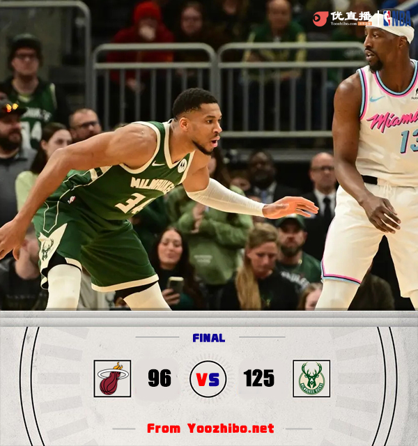 JRS直播网讯 1月24日讯 NBA常规赛,雄鹿客场挑战热火。雄鹿4连胜以24胜17负高居东部第4,热火21胜21负东部第9。本场比赛因天气原因被延迟1小时开赛,巴特勒被球队禁赛。一开场,雄鹿手感冰凉,热火打出13-3的攻势取得两位数领先,字母哥高效输出带队迅速迫近比分,次节雄鹿全面回暖,单节轰下44分净胜热火19分,利拉德1秒内连投带罚收获6分,半场战罢雄鹿71-55领先热火。下半场,双方命中率下降,得分都很困难,雄鹿率先回暖将分差拉开到20分以上,末节双方围绕20分的分差展开拉锯战,热火大势已去无力回天。最终,雄鹿125-96大胜热火,客场过关。