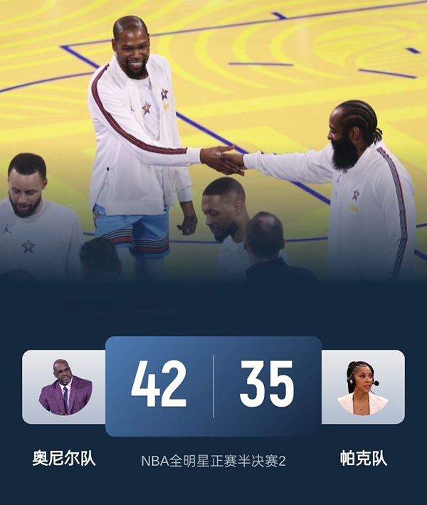 奥尼尔队:利拉德9分3板2助、库里8分6板1助、杰伦-布朗8分、塔图姆6分2板2助、杜兰特4分3板3助、欧文4分3板2助2断、哈登3分1板2助。