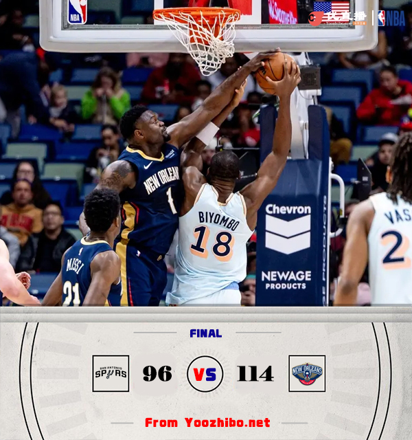 马刺(24-31):锡安22分9板3助2断2帽、马特科维奇19分6板1助、墨菲15分7板5助、奥利尼克14分15板2助、阿尔瓦拉多12分9板8助、麦科勒姆12分3板7助、霍金斯10分3板、米西6分15板1助、布鲁斯-布朗2分、里夫斯2分、厄尔2板。