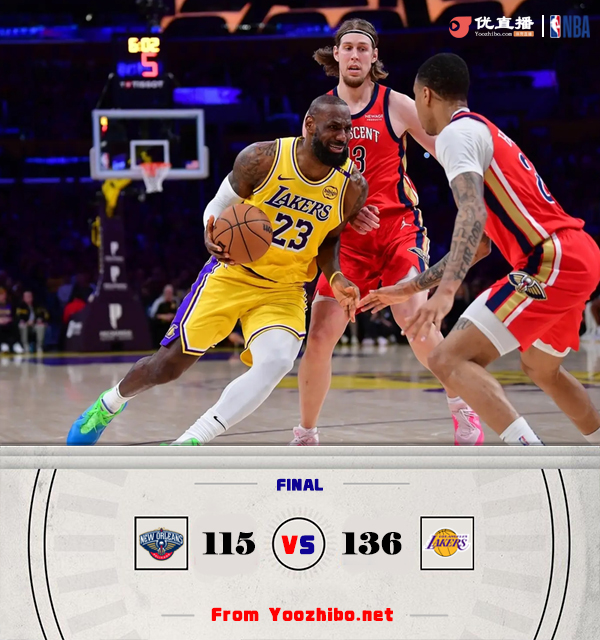 JRS直播网3月5日讯 NBA常规赛,湖人主场迎战鹈鹕,湖人目前6连胜后38胜21负高居西部次席,鹈鹕则是17胜44负排在西部第14位。本场比赛,里夫斯、八村塁和古德温继续缺阵。比赛开始,詹姆斯通过一记三分达成50000分神迹,随后东契奇连进3记三分带队13-2攻击波拉开比分,锡安连续攻击内线止血,首节湖人领先13分,次节霍金斯接连三分追分,锡安持续冲击内线单节砍13分,鹈鹕20-7攻击波一度追平比分,詹姆斯接连三分带队回应11-0攻击波止血,海斯连续内线吃饼暴扣半场砍19分,湖人依然领先10分。下半场,双方接连突破造杀伤展开拉锯战,东契奇三分继续火热,而且接连送助攻,湖人打出16-3攻击波直接拉开20分以上领先,末节锡安继续冲击内线挡不住,但詹姆斯里突外投强势回应,分差始终保持在20分左右,最终湖人136-115轻取鹈鹕,拿到7连胜。